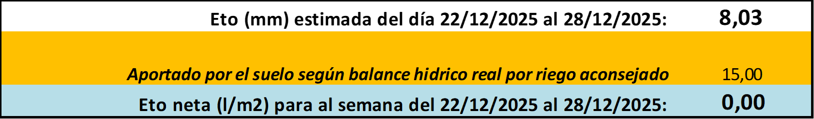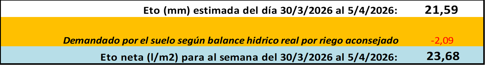 En base a los datos históricos (media de los años 2000-2017), corregidos según la variación medida en la anterior semana, obtenidos en la estación Agroclimática del Instituto Valencianos de Investigaciones Agrarias (IVIA), sita en la partida del Pozuelo (TM de Pedralba), se indica a continuación la dosis de riego aconsejada para la semana en curso.