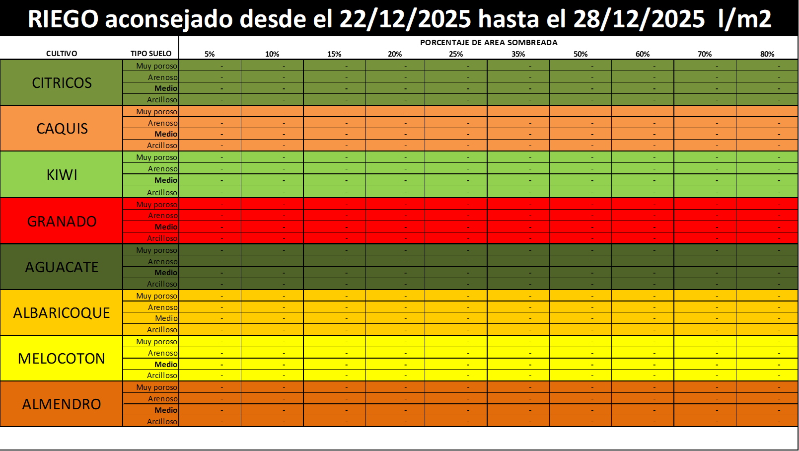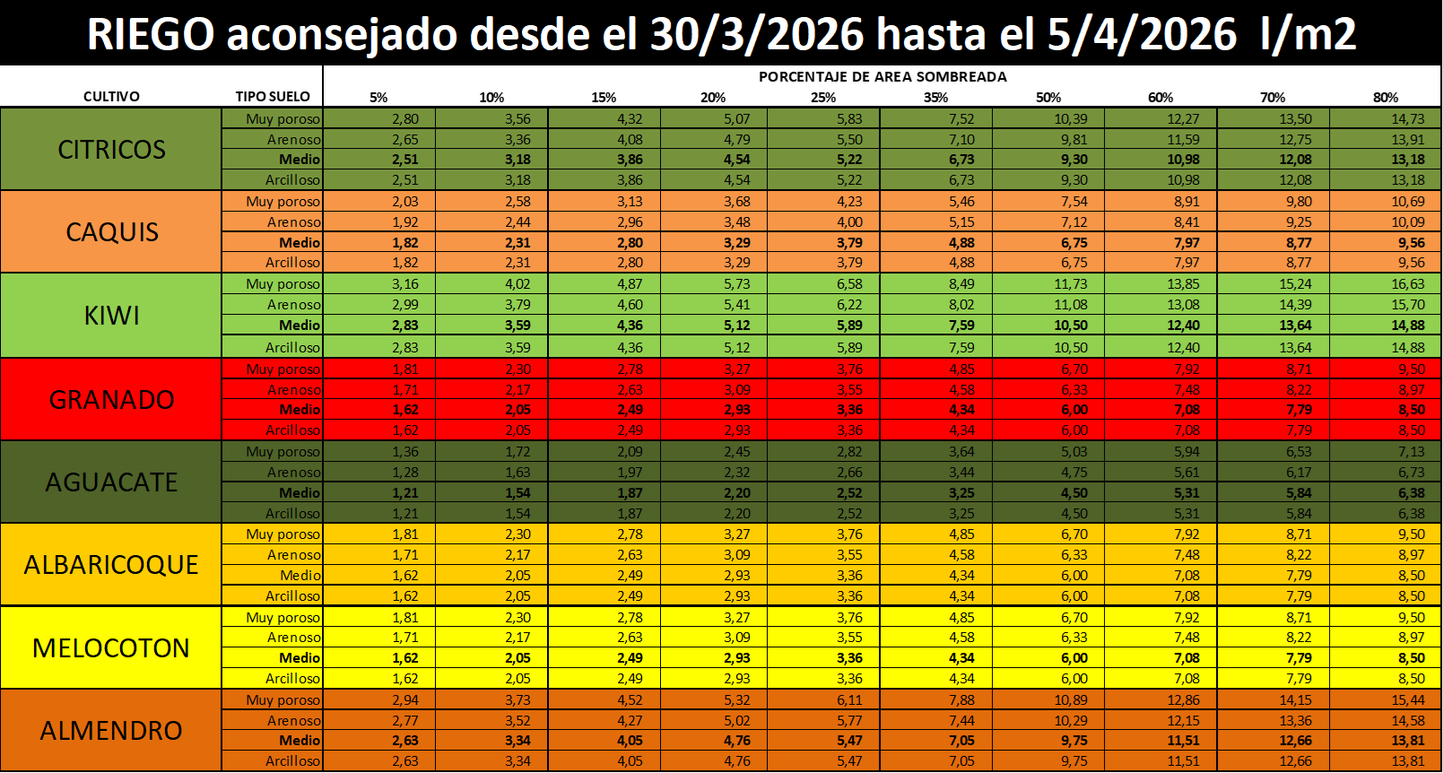 En el cuadro debe elegir, según el tamaño de sus árboles, el tipo de suelo y la variedad, el dato de la DOSIS aconsejada correspondiente. Este valor indica la Necesidad Neta de Riego. Para saber las horas de riego que usted debe emplear, siga las instrucciones de la fórmula que se indica debajo