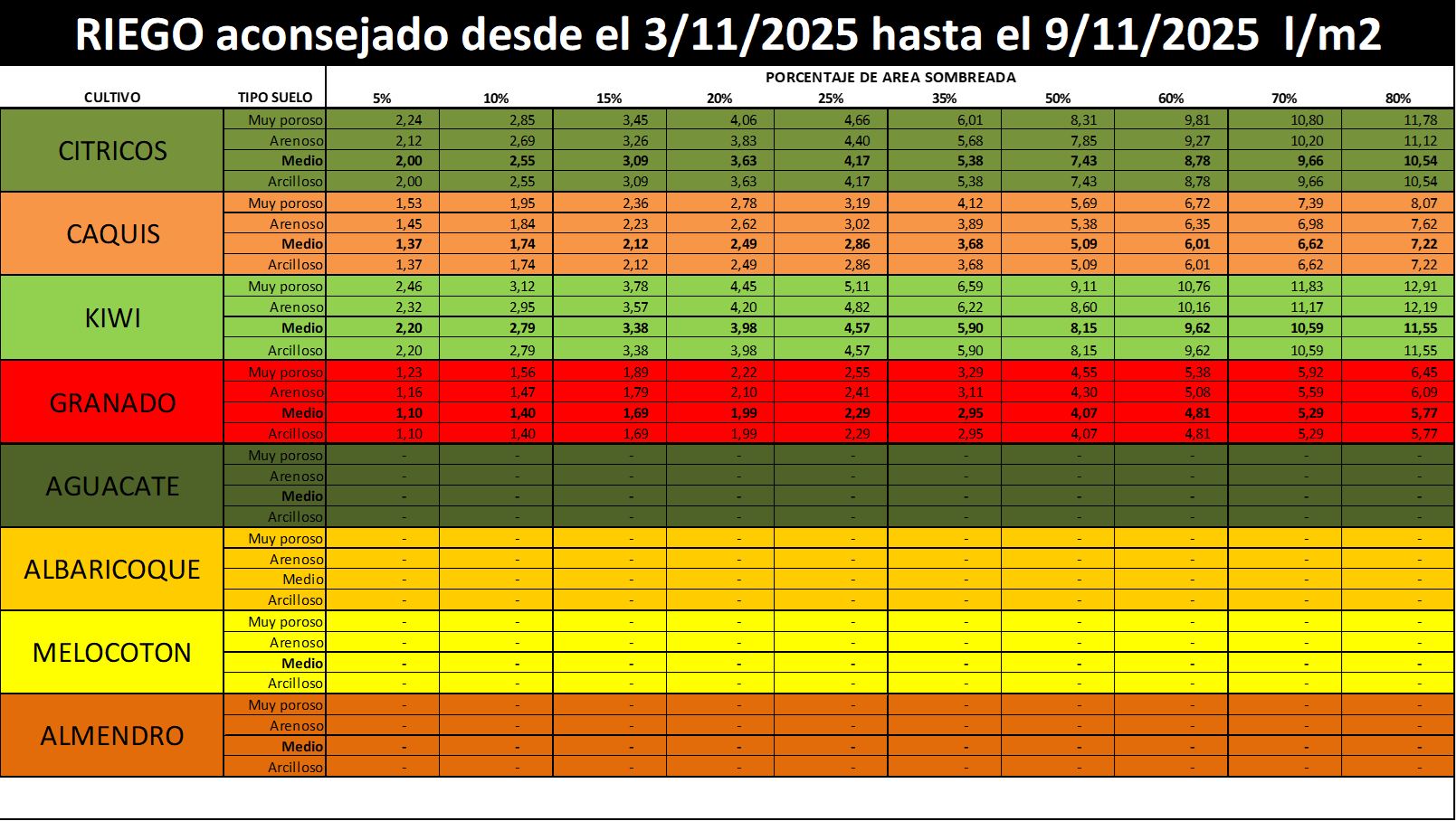 En el cuadro debe elegir, según el tamaño de sus árboles, el tipo de suelo y la variedad, el dato de la DOSIS aconsejada correspondiente. Este valor indica la Necesidad Neta de Riego. Para saber las horas de riego que usted debe emplear, siga las instrucciones de la fórmula que se indica debajo